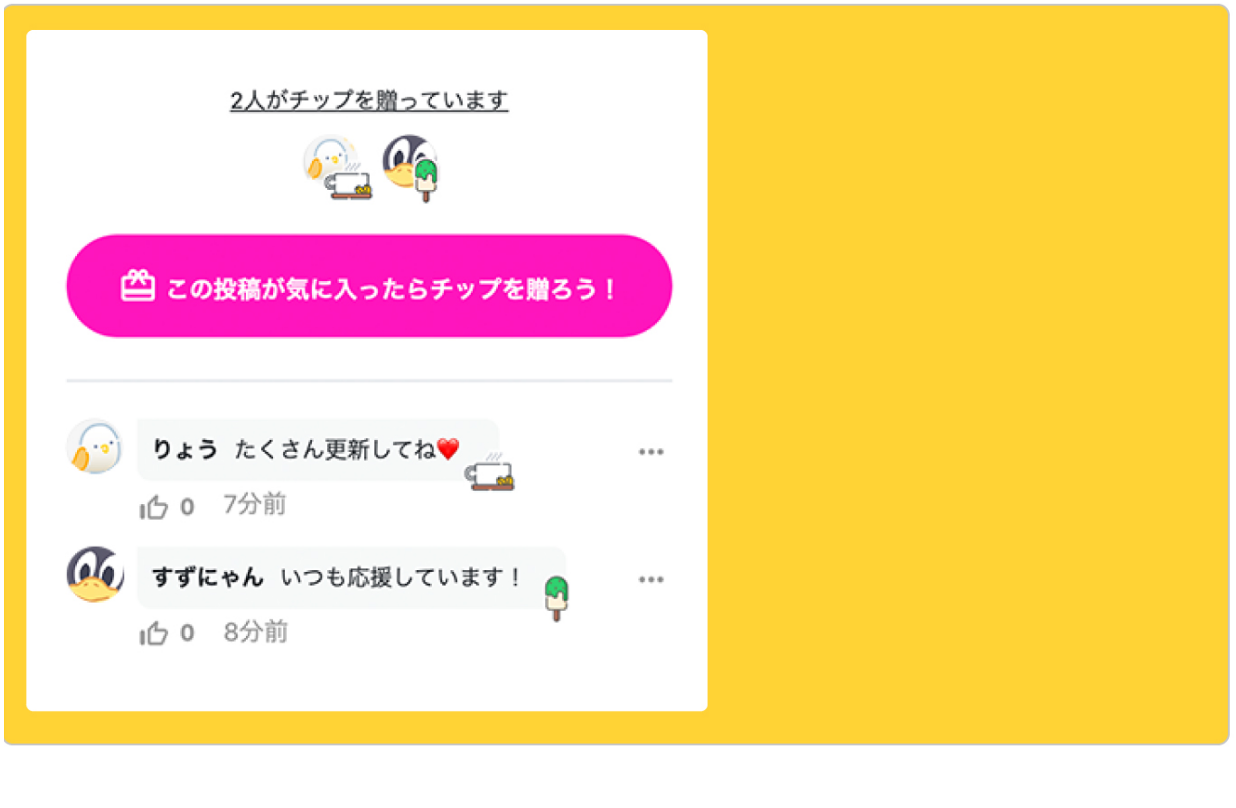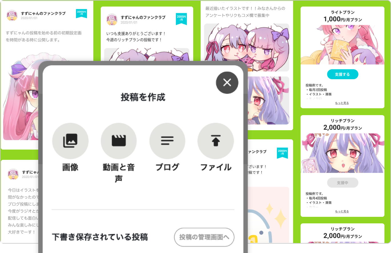 例) イラストレーターの場合 500円プラン:月に1~2回程度で、SNSなどでアップロード作品した作品のラフ画や高画質版などを公開+近況ブログの更新 1000円プラン:上記に加え、過去販売した作品を数ヶ月に1回程度無料公開 3000円プラン:上記に加え、1年継続された方はラフ画のリクエストを受け付ける